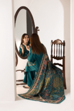 3PC DHANAK EMBROIDERED SHIRT WITH DHANAK (DAMAN-PATCH) PRINTED WOOLEN SHAWL AND PLAIN TROUSE